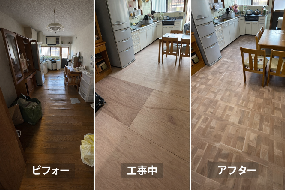 長年使用されたフローリングは、表面の傷みや色あせが進行し、一部に沈み込みも見られる状態でした。